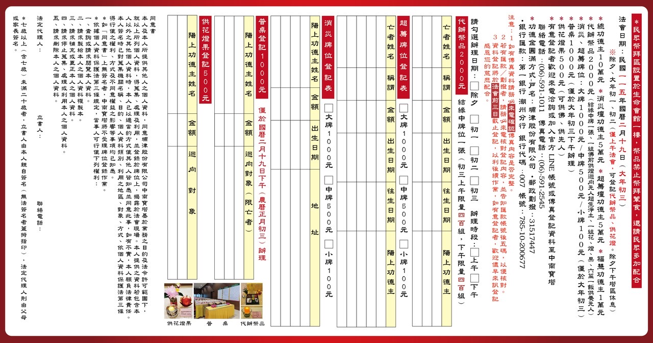 除夕(2/16)、大年初一(2/17)、初二(2/18)僅上午法會,提供代辦祭品、供花燈果服務。 您可透過Line或直接來電登記 連絡電話:06-5911011 (若您已登記,則可忽略此訊息) 功德金圓滿方式 戶名:埔津股份有限公司 郵政劃撥:31517447 銀行匯款:第一銀行 潮州分行 銀行代碼:007 帳號:785-10-200677 ※匯款完成,請告知匯款帳號後5碼※ 敬祝吉祥平安